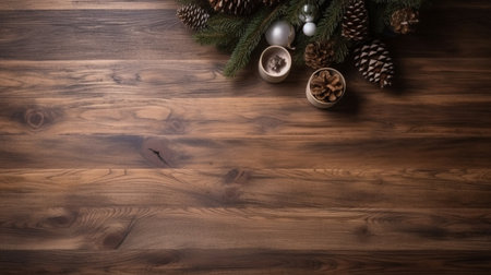 Christmas Holiday Theme Background with space for text on Wooden Background. Selective focus.