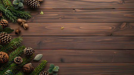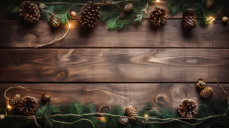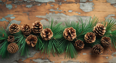 A festive arrangement of natural pine cones and evergreen branches adorns a rustic wooden surface. The scene evokes a cozy and traditional holiday spirit.