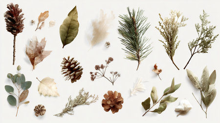 Collection of dried leaves, pine cones, and branches arranged on a light background