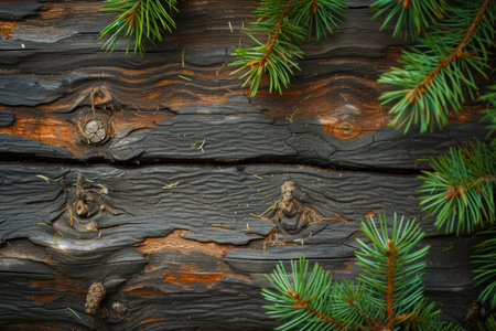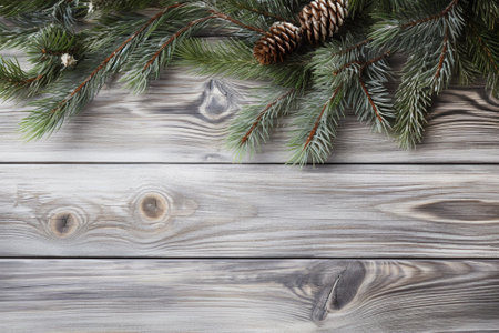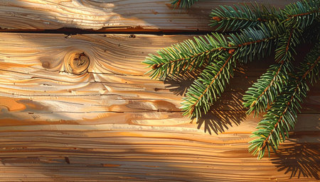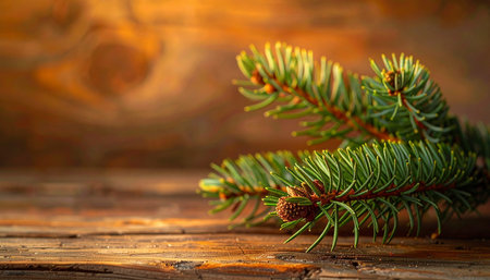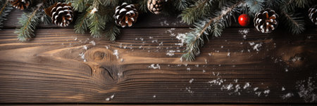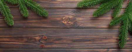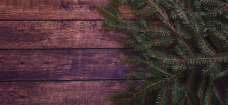 Spruce Branches on Rustic Wooden Background horizontal banner