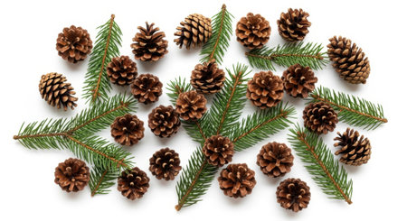 Various pine cones and winter foliage on white background. Concept of nature, winter, Christmas decor, seasonal ornaments.