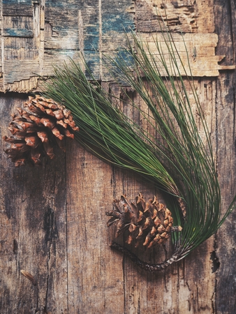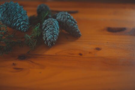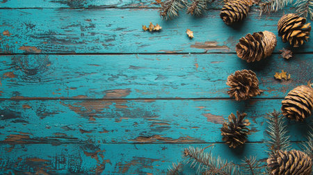 A rustic composition featuring pine cones and evergreen branches arranged on a distressed, weathered blue wooden background, evoking a cozy, natural, and seasonal atmosphere.