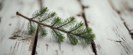 AI Generated. Green Pine Branch on Rustic White Wooden Background