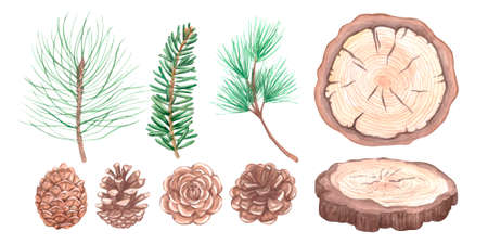 Conifer branches, cones and saw cut tree illustration set. Pine, spruce, fir tree branches and cones, wood slice. Winter nature botanical elements clipart