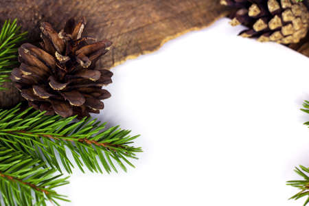 Natural green fir tree branches with needles and pine cones as a frame with white copy space for text flat lay.