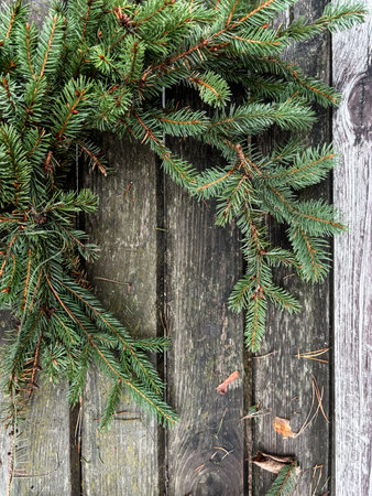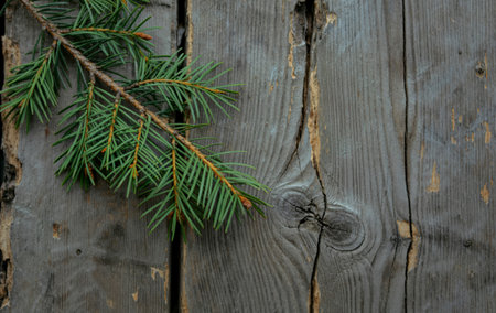 branch of spruce on a gray wooden surface with cracks and knots, empty space
