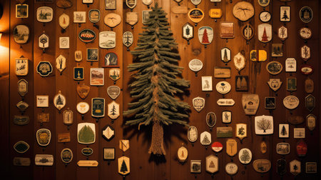 A wooden table adorned with slices of wood and pine cones, creating a natural and rustic look. High quality photo