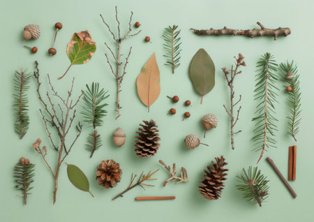 Arrangement of various natural elements like leaves, twigs, and pine cones on a soft green background