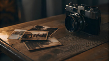 A vintage camera resting on a rustic table surrounded by old photographs and papers, evoking nostalgia and the passage of time in a timeless setting.