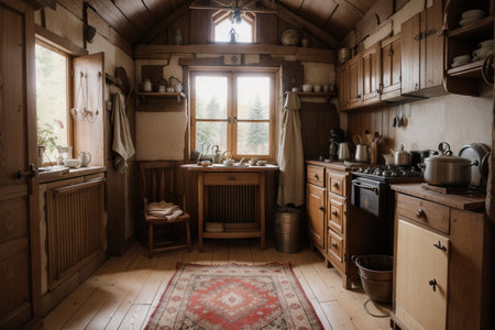 The interior of an old Russian hut with old baby cradle, russian stove, spindle, samovar, dry herbs,balalaika, matryoshka, bast shoes, jam, wooden bucket, windows, door.Old kitchen interior.Сartoon