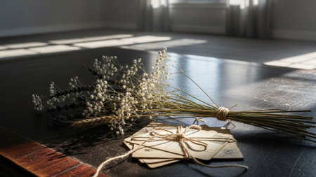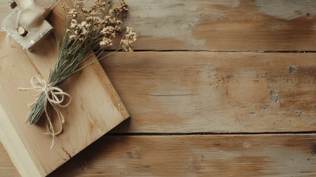 Dried flowers tied with twine are placed on a rustic wooden surface showcasing natural beauty and simplicity in an inviting setting.