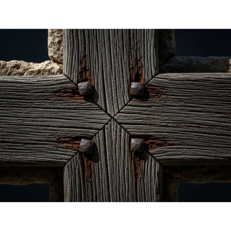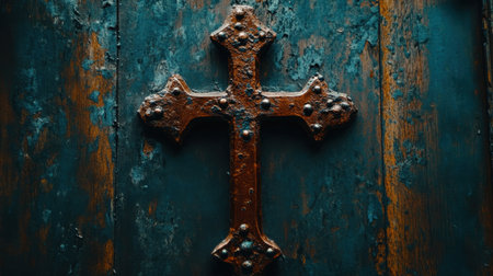 A detailed view of a rusty metal cross mounted on a weathered wooden background, evoking feelings of spirituality, history, and rustic charm in a unique artistic composition.