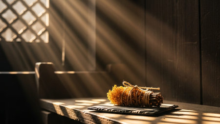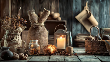 A cozy still life arrangement featuring burlap-wrapped items, a glowing candle, and dried herbs. This rustic setup exudes a warm, natural ambiance, ideal for themes of sustainability and simplicity.