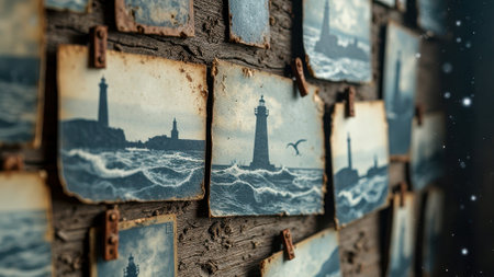 Vintage lighthouse photos on rustic wooden board depicting ocean waves and seagull.