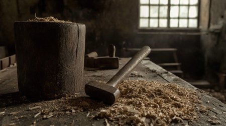 An intimate close-up of a rustic woodworking scene, showcasing essential tools like a mallet and shavings on a weathered table, bathed in soft light.