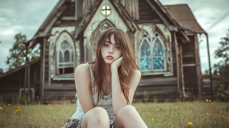 A young girl sits pensively in front of a broken-down school, her thoughtful expression capturing the essence of solitude in nature.