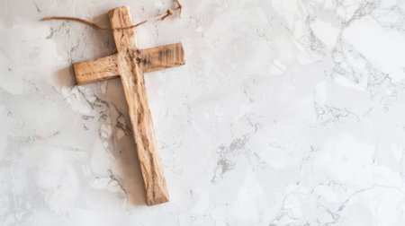 A wooden cross is placed on a sleek marble surface, creating a simple yet striking contrast between materials. The cross stands upright, casting a shadow on the smooth white marble.