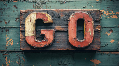 A weathered wooden sign featuring the word GO in bright red and yellow resting against a textured green wall in daylight.