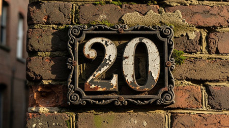 House number plate hanging outside the beautiful building with brown pattern decoration building on the street. Number 20, twenty