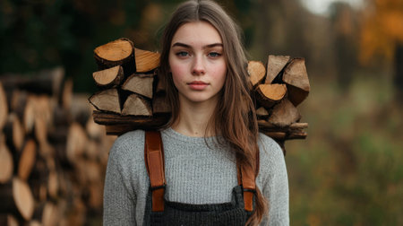 A woman is standing in front of a pile of wood logs. She is wearing a gray sweater and a black apron