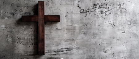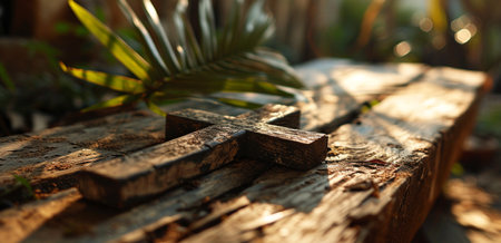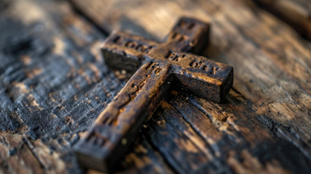 Simple wooden cross is standing on a rustic table, evoking themes of faith, hope, and the enduring power of belief