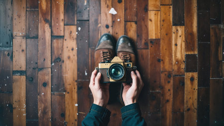Photographer holding vintage camera sitting on wooden floor, point of view shot. Ai generated image