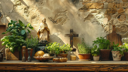 Rustic kitchen setting with a small Saint Joseph shrine, surrounded by traditional Italian cooking utensils and herbs.