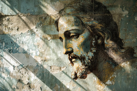 The face of Jesus Christ on the wall of an old church.