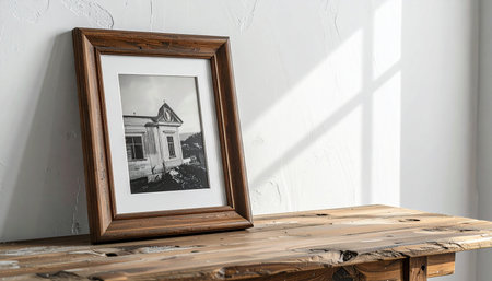 Old wooden photo frame on old wooden table in front of white wall