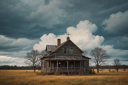 Abandoned wooden house in the middle of meadow with dramatic sky