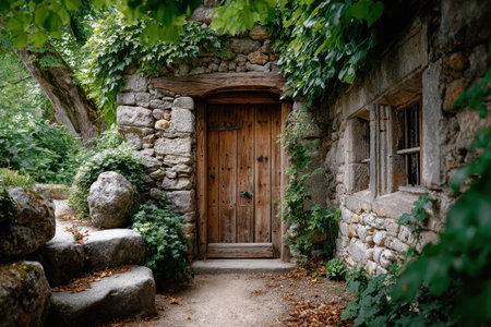 A weathered stone building with a wooden door and overgrown ivy