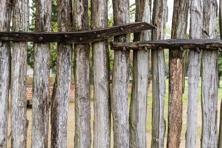 horizontal front view of a wooden fence with a rustic background