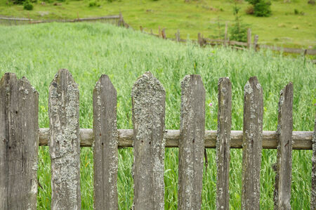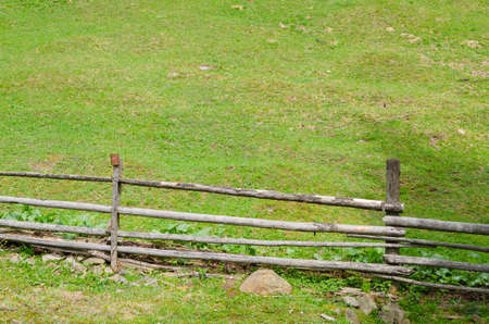 Grass on green summer pasture with wooden fence on farm in Carpathian mountains in Ukraine