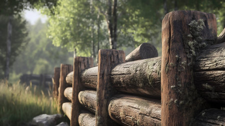 Wooden fence in the forest with fog in the background. 3d rendering