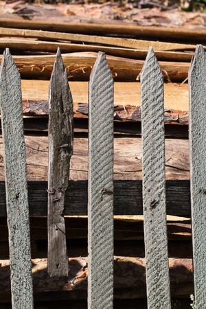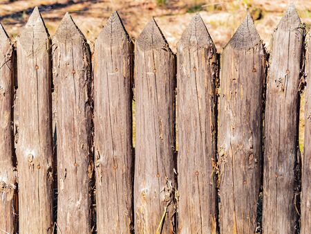 Old rural wooden fence. Fencing made of natural boards of different sizes.