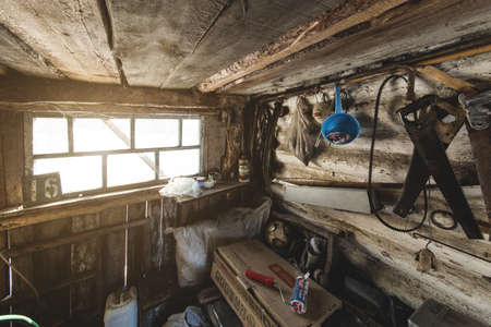 Ufa, Russia February 24, 2018: Inside a very old village wooden shed. Storage of things and tools