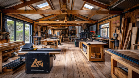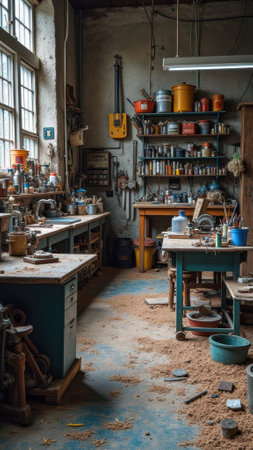 Spacious industrial workshop with abundant natural light and artisan tools. That the image is generated using AI.
