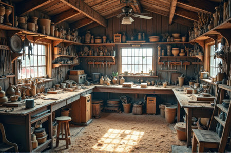 Rustic pottery workshop with sunlit windows and wooden shelves displaying handmade clay vessels. That the image is generated using AI.