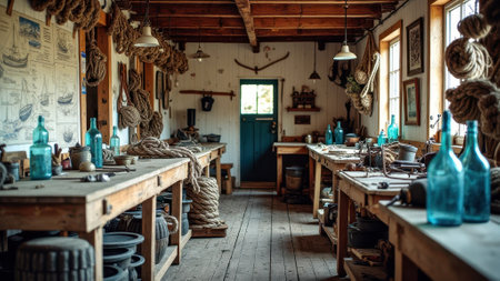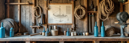 Rustic nautical workshop with wooden tools and maritime decor. That the image is generated using AI.