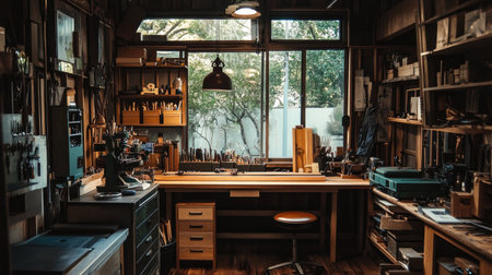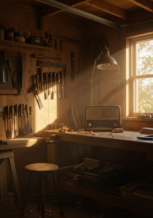 Cozy woodworking shop, tools on walls, sunlit window, rustic atmosphere, workshop charm