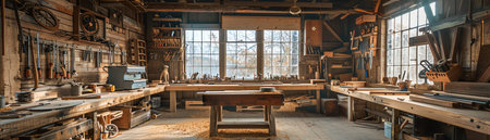 Woodworking shop filled with tools and sawdust, cozy and traditional