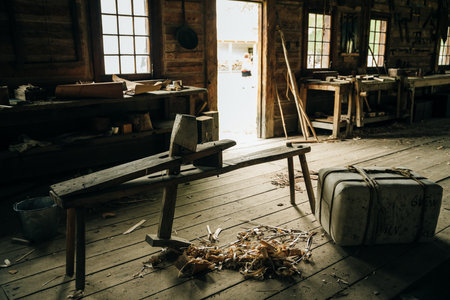 This vintage workshop offers an intimate view of antique tools and machinery, showcasing a nostalgic atmosphere under warm natural light illuminating wooden beams.