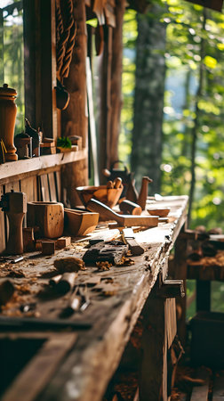 A rustic studio filled with wooden objects, tools, and materials, capturing the essence of woodworking craftsmanship.