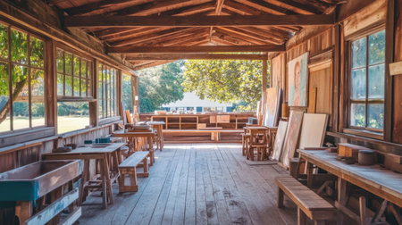 Spacious workshop featuring wooden benches and tables bathed in natural light, creating an inspiring atmosphere for artistic projects and creative endeavors.