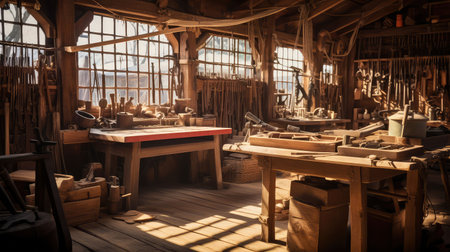 Rustic woodworking workshop with tools and wooden furnishings in cozy lighting. That the image is generated using AI.