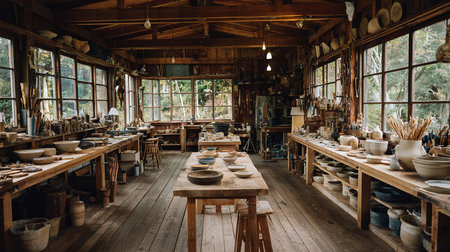 Interior of a rustic pottery workshop in the countryside.