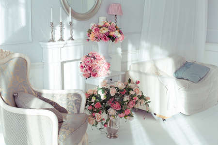 luxury clean bright white interior. a spacious room with sunlight and flowers in vases