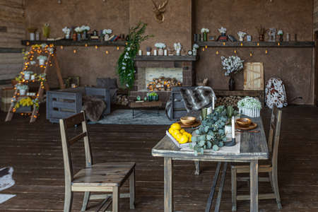 Festive kitchen in Christmas decorations. Candles, spruce branches, wooden stands, table laying. Photo