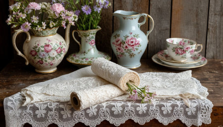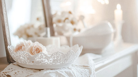 Interior design inspiration of Farmhouse Shabby Chic style home dining room loveliness decorated with Wood and Lace material and Chandelier .Generative AI home interior design .