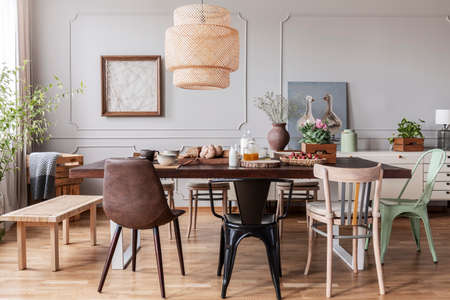Chairs at wooden dining table under lamp in dining room interior with posters and flowers. Real photo